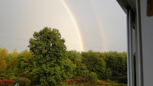 Last night after a month of being out and about nearly every day and night of each week I was very honestly thrilled that cheer and soccer were cancelled because of the weather. I was so happy to stay warm and dry in our home as a family with a hot, home-cooked meal…not re-heated or leftover. As we sat down to dinner Nathan said Look at the rainbow! It wasn’t just one! There were 2 of them! I’ve never seen anything like it. Our conversation wasn’t centered around pots of gold…but God’s faithfulness…His promises. God brought our family devotional time to life with the most amazing sight in which every member of our family was in awe. Even Jackson spouted another new word…cooool. After that display…God gets my vote for ArtPrize this year! I was so filled with God’s joy and peace. Thankful doesn’t even begin to express the overwhelming feeling. It was such a gift to end this crazy, chaotic month. And I’m so glad I didn’t miss it!